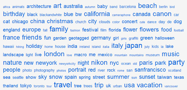 La presentación de tags en forma de nubes puede considerarse un clásico porque lo hemos visto repetidas veces en blogs, prensa y redes sociales. Se trata de presentar por orden alfabético las palabras que los usuarios han indicado que son tags, es decir, palabras clave que describen bien el contenido que han publicado. Dentro del orden alfabético puede verse que algunos tags son de mayor tamaño, esto se debe a que son palabras que aparecen más a menudo dentro del sistema en el que se está representando la inforamción a partir de sus tags; a mayor tamaño, más repetición de la palabra.