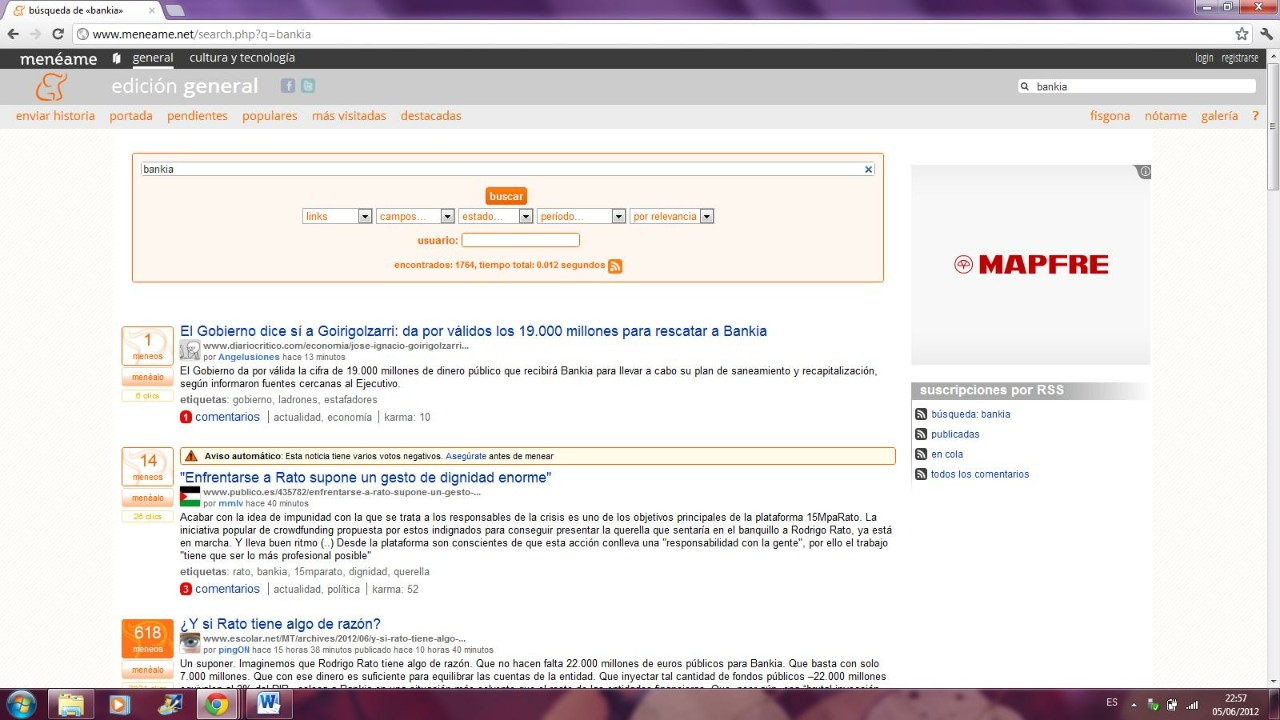 Para el ejercicio he buscado las noticias sobre Bankia y he votado la que me ha parecido más relevante. Tengo que reconocer que mi primera tentación ha sido votar a la noticia más meneada aunque finalmente he seleccionado aquella que me parecía por su contenido la que más se acercaba al interés que tenía sobre el tema. Todo esto me ha hecho reflexionar sobre el sistema utilizado, dándome cuenta que muchos de los usuarios se van a dejar llevar por las mayorías. Otro aspecto a destacar es el sistema de búsqueda y como se puede filtrar a través de unos parámetros que ofrece Meneame. Además los resultados se pueden ordenan a través de la fecha o la relevancia. Un valor añadido en la página son los comentarios realizados a las noticias meneadas.