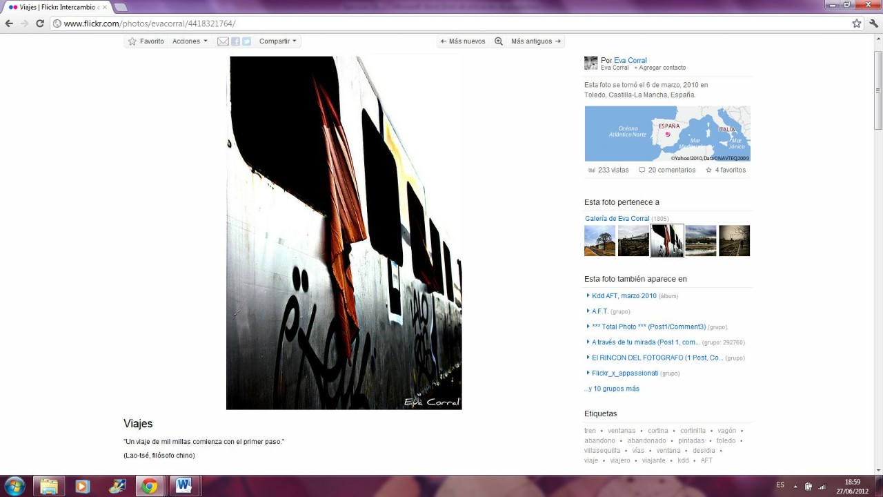 Este sitio Web (Flickr) ha ofrecido a los autores la posibilidad de asignar palabras claves, tags o etiquetas para describir sus fotografías. Esta plataforma ofrece la opción de utilizar hasta 75 etiquetas o tags. He seleccionado esta fotografía que contiene 17 etiquetas. (tren, ventanas, cortina, cortinilla, vagón, abandono, abandonado, pintadas, Toledo, Villasequilla, vías, ventana, desidia, viaje, viajero, viajante, kdd, AFT ).