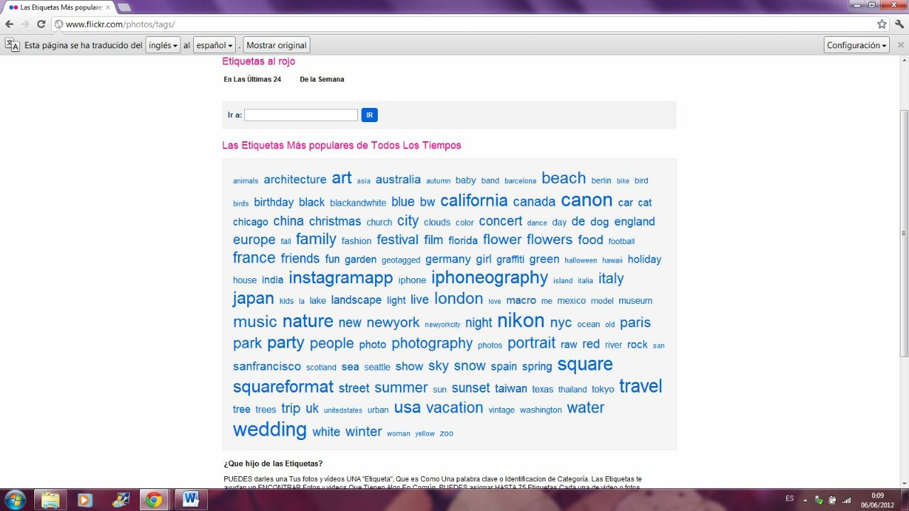 El recurso elegido anteriormente no contiene nube de etiquetas. A continuación seleccionamos una “nube de tags” de la plataforma Flickr donde están representados las etiquetas más utilizadas en la última semana para describir fotografías. Las etiquetas están ordenadas alfabéticamente y han utilizado la fuente de mayor tamaño en aquellas más usadas.