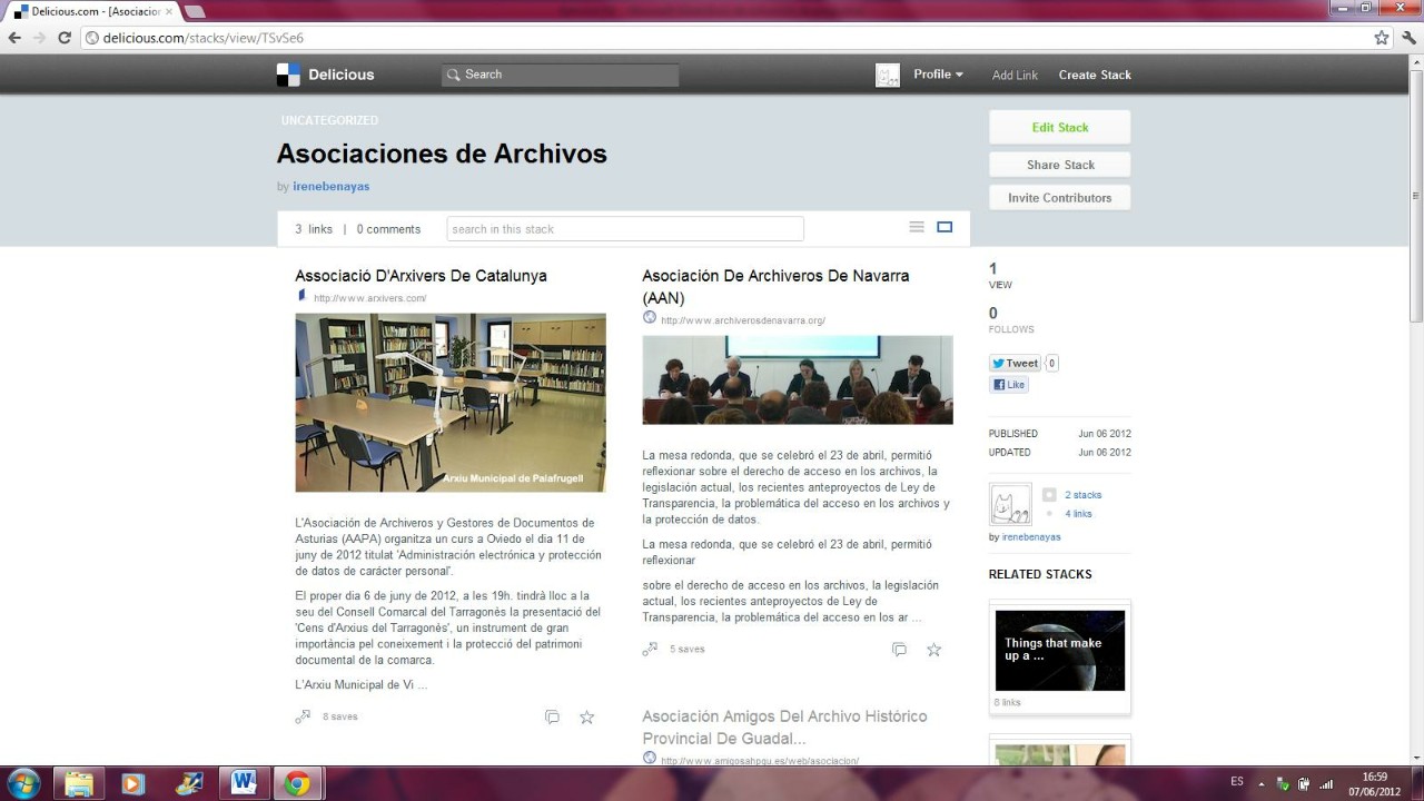 Me he registrado en Delicious y he seleccionado varios documentos de mi interés. He empezado seleccionando los enlaces de los sitios Web de las asociaciones de archivos con mayor actividad como la Asociación de Archivos de Navarra, la Asociación de Archiveros de Cataluña… He creado varios Tags para describir cada documento como archivos, asociaciones, cursos, publicaciones, Cataluña, Navarra. También he seleccionado los blogs que me parecen más interesantes de archivos: archivística.net, archivología. Los he asignados varias etiquetas como blog, archivos, novedades…A continuación he creado Stacks para agrupar los documentos o enlaces de las páginas de las asociaciones.